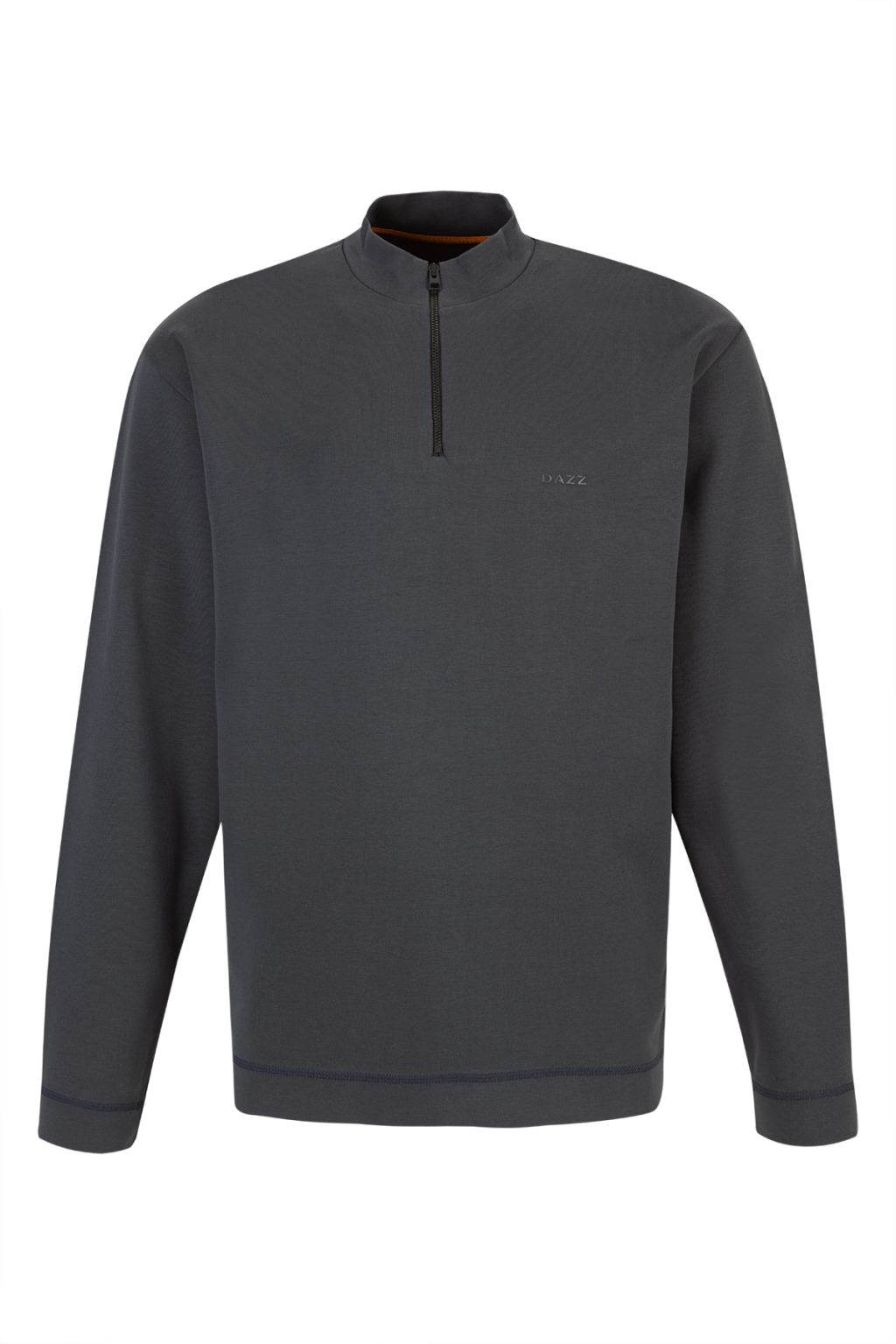 Navy blue cotton long-sleeve T-shirt, regular fit, with a mock neck and half-zip YKK fastening, renowned for its durability and smooth operation. The tonal DAZZ logo on the chest, with raised application, adds a subtle, sophisticated detail, while the rear rectangular orange felt label and the orange binding inner tape provide a distinctive signature touch.