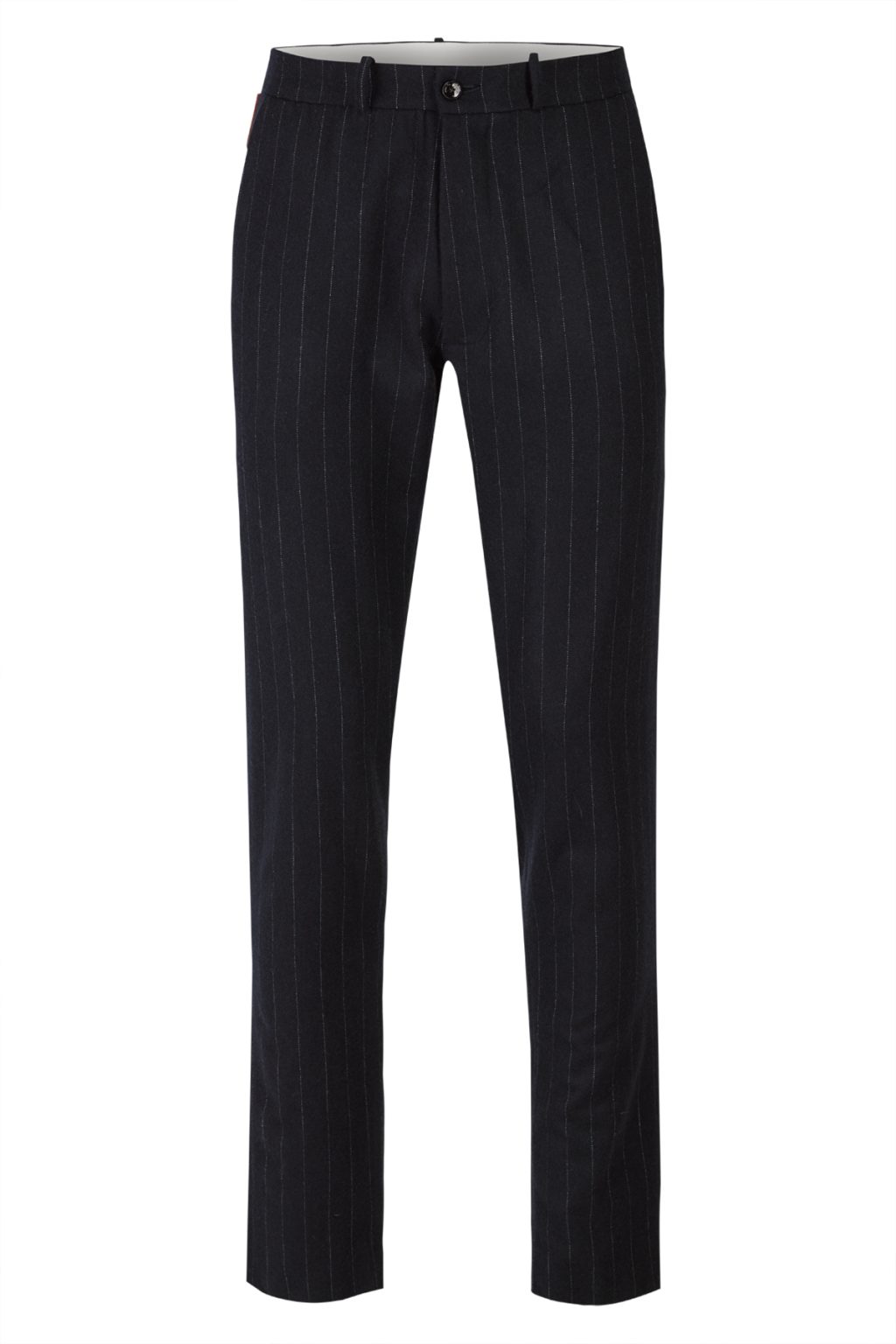 introduzem volume e conforto, enquanto as pinças traseiras definem subtilmente a cintura e o assento. Os bolsos frontais oblíquos reforçam o caráter de alfaiataria da peça, sendo complementados atrás por um bolso traseiro de vivo duplo com botão, rematado com um detalhe em fita de nastro laranja néon, que acrescenta um toque expressivo. As presilhas para cinto garantem versatilidade de uso, enquanto a braguilha com fecho de correr oculto e botão