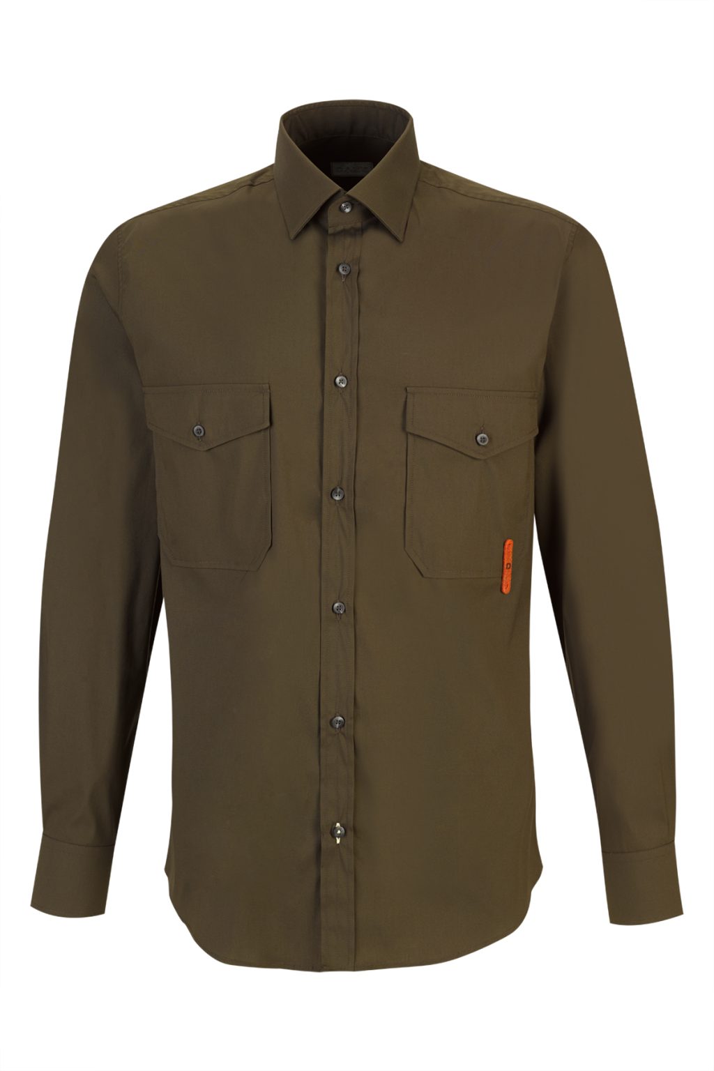 Camisa clássica em popelina de algodão verde-floresta, de corte slim, com gola clássica em ponta, mangas compridas com punhos abotoados e fecho frontal de botões. Apresenta dois bolsos aplicados com aba no peito, bainha curva, escapulário traseiro com prega central e última casa do botão pespontada em amarelo. Rematada com uma etiqueta de feltro laranja no bolso do peito.