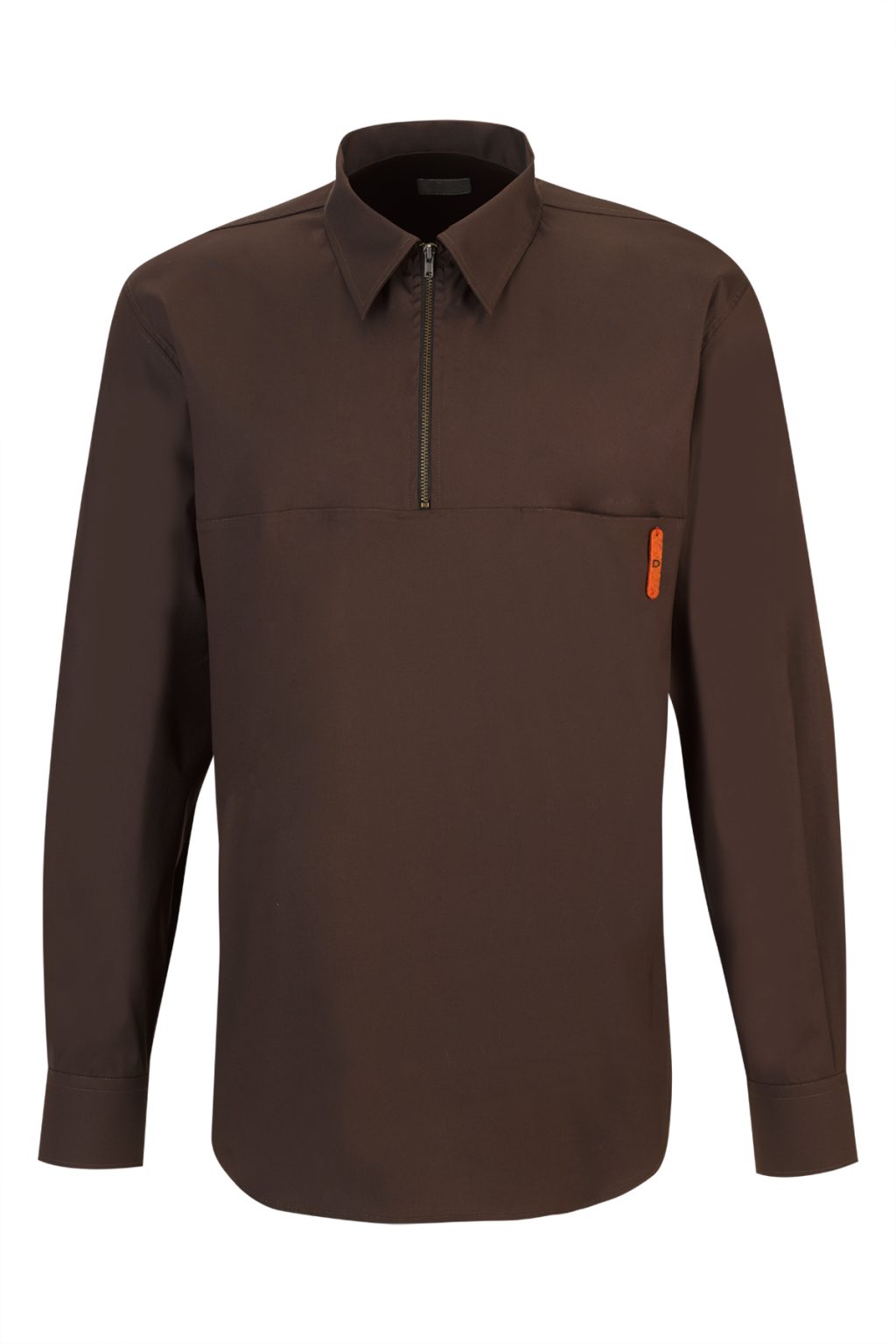 Sobrecamisa pólo em algodão com elastano castanho chocolate, corte slim, com colarinho de pólo em ponta, mangas compridas com punhos abotoados e meio fecho de correr frontal. Apresenta escapulário frontal com bolso para cartão, bainha curva e escapulário traseiro com prega central. Finalizada com etiqueta de feltro laranja no peito e etiqueta interior prateada.